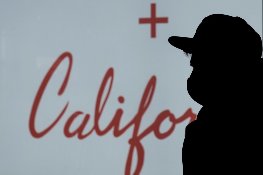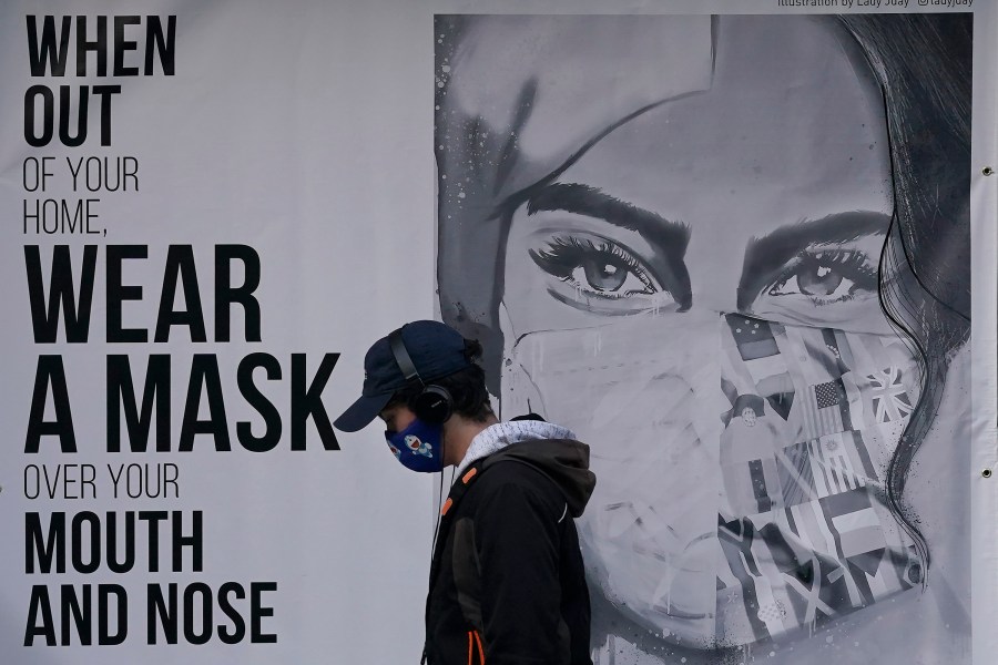 FILE – In this Saturday, Nov. 21, 2020, file photo, a pedestrian walks past a mural reading: “When out of your home, Wear a mask over your mouth and nose,” during the coronavirus outbreak in San Francisco. San Francisco is joining a statewide curfew and Silicon Valley is banning all high school, collegiate and professional sports and imposing a quarantine for those traveling into the region from more than 150 miles away. Santa Clara County has the highest case rate in the Bay Area, leading to the stricter rules, said Santa Clara County Health Officer Dr. Sara Cody. (AP Photo/Jeff Chiu, File)