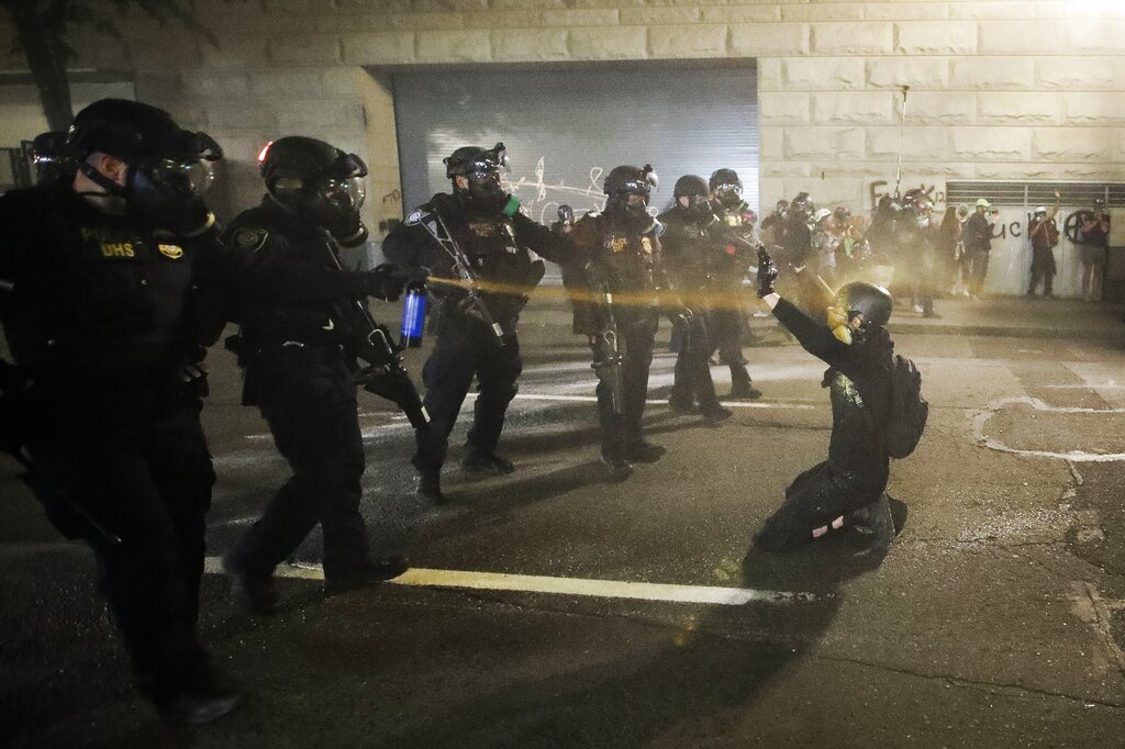 In this July 29, 2020, file photo, a demonstrator is pepper sprayed shortly before being arrested during a Black Lives Matter protest at the Mark O. Hatfield United States Courthouse in Portland, Ore. (AP Photo/Marcio Jose Sanchez, File)
