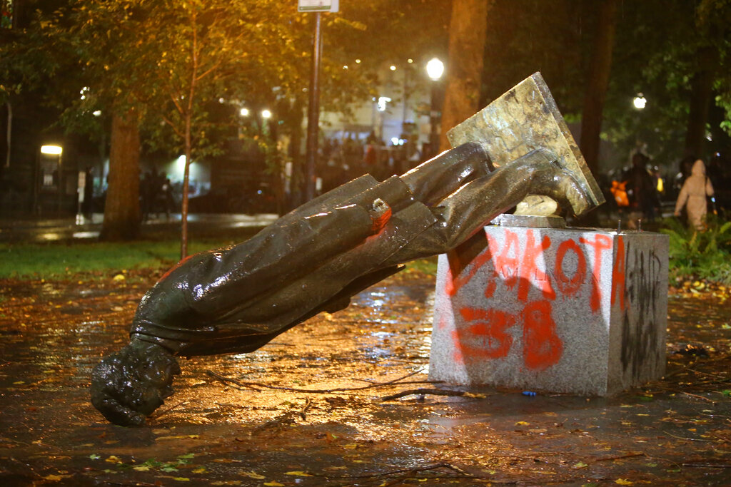The group threw chains around Roosevelt’s statue, officially titled “Theodore Roosevelt, Rough Rider.” The crowd pulled down the statue just before 9 p.m.