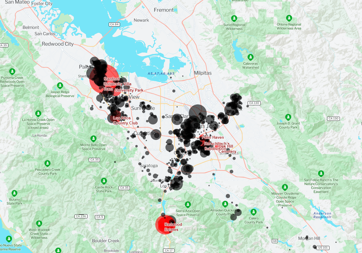 The map above shows the clusters of racial covenants around Santa Clara County. Some of the largest and most notable racially restricted developments are shown in red, with dots representing smaller subdivisions. The interactive version of the map can be found here.