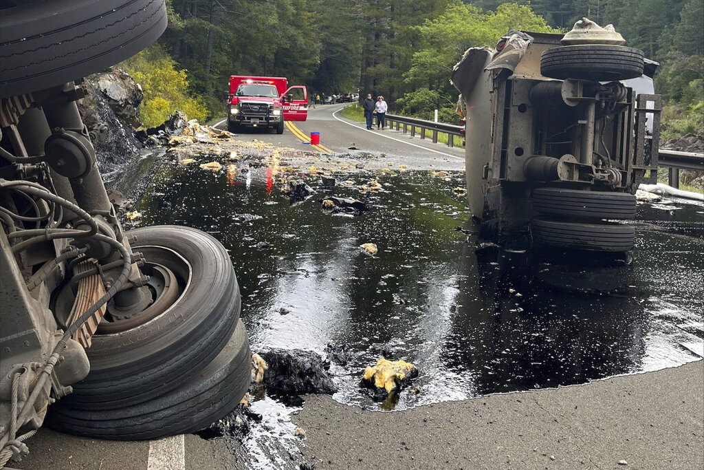 GASQUET, Calif. (AP) — A truck that crashed on a remote highway spilled 2,000 gallons of hot asphalt binder in a Northern California forest last week and the driver was arrested on suspicion of DUI, authorities said.
