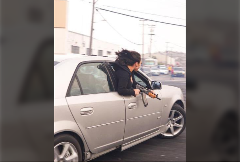 SAN FRANCISCO, Calif. (KRON) — A photo posted Wednesday by the San Francisco Police Department shows a woman hanging out of the passenger side window of a moving car while holding an AK47.