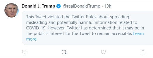 “We placed a public interest notice on this Tweet for violating our COVID-19 Misleading Information Policy by making misleading health claims about COVID-19. As is standard with this public interest notice, engagements with the Tweet will be significantly limited,” Twitter said in a statement.