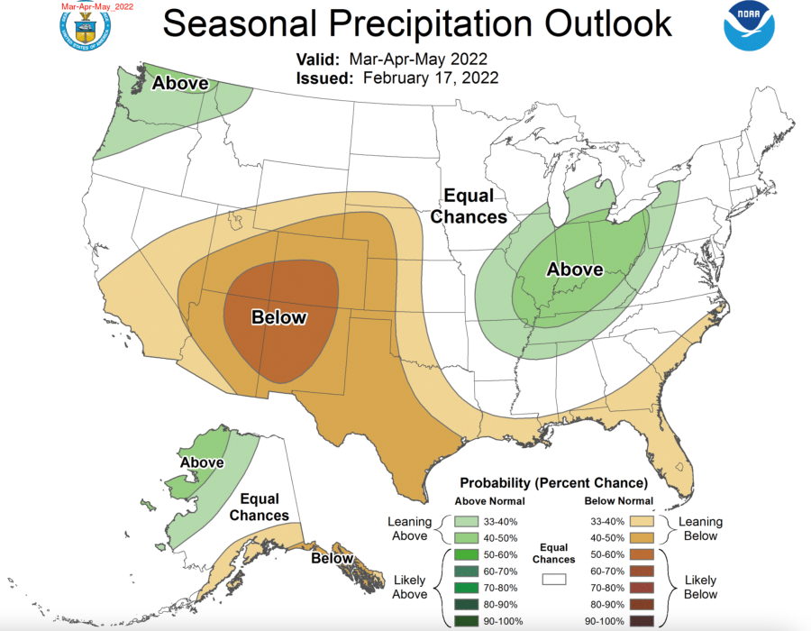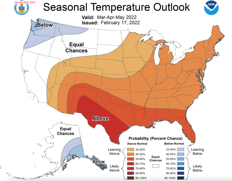 Between March and May, forecasters with the National Oceanic and Atmospheric Administration are predicting warmer-than-average temperatures in the southwest, southeast and Gulf States. The Pacific Northwest may see a cooler spring, according to NOAA.
