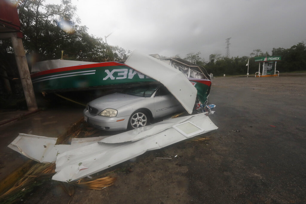 Vehicles lay under a metallic structure brought down by the winds of Hurricane Grace in Playa del Carmen, Quintana Roo state, Mexico, Thursday, Aug. 19, 2021. The Category 1 storm made landfall at 4:45 a.m., just south of the ancient Mayan temples of Tulum, pelting the Caribbean coast with heavy rain and pushing a dangerous storm surge. (AP Photo/Marco Ugarte)