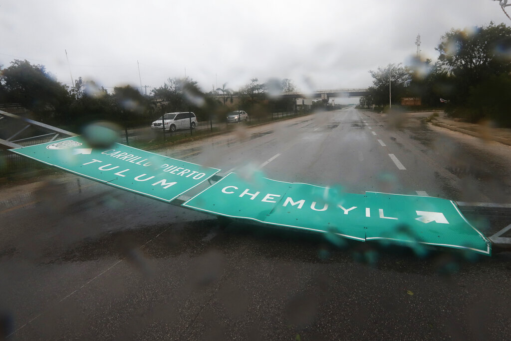 A road sign brought down by the winds of Hurricane Grace straddles one lane of a highway in Tulum, Quintana Roo state, Mexico, Thursday, Aug. 19, 2021. The Category 1 storm made landfall at 4:45 a.m., just south of the ancient Mayan temples of Tulum, pelting the Caribbean coast with heavy rain and pushing a dangerous storm surge. (AP Photo/Marco Ugarte)