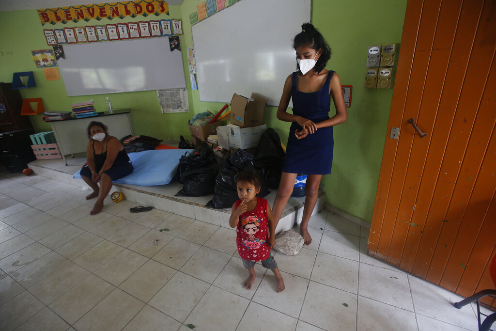 A family stays at a school used as a shelter after Hurricane Grace blew past Tulum, Quintana Roo state, Mexico, Thursday, Aug. 19, 2021. The Category 1 storm made landfall at 4:45 a.m., just south of the ancient Mayan temples of Tulum, pelting the Caribbean coast with heavy rain and pushing a dangerous storm surge. (AP Photo/Marco Ugarte)