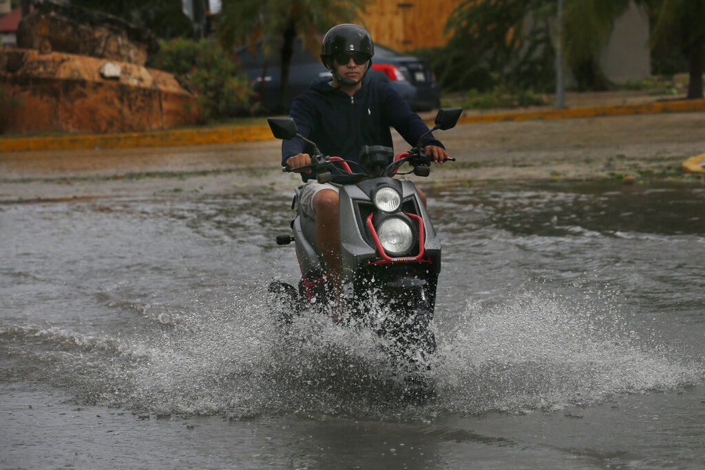 A motorcyclist crosses a flooded street after the passage of Hurricane Grace in Tulum, Quintana Roo state, Mexico, Thursday, August 19, 2021. The Category 1 storm made landfall at 4:45 am, just south of the ancient Mayan temples of Tulum, hitting the Caribbean coast with heavy rain and causing a dangerous storm surge. (AP Photo/Marco Ugarte)