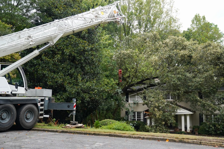 ATLANTA, GEORGIA – SEPTEMBER 27: A tree crew works to remove a tree on a house in Buckhead after hurricane Helene brought in heavy rains overnight on September 27, 2024 in Atlanta, Georgia. Hurricane Helene made landfall late Thursday night as a category 4 hurricane in the panhandle of Florida and is working its way north, it is now considered a tropical storm. (Photo by Megan Varner/Getty Images)