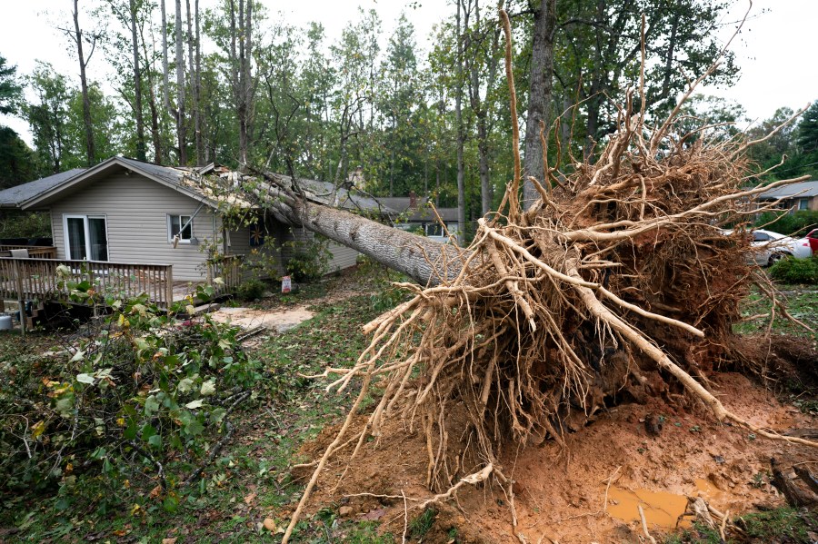 ASHEVILLE, NORTH CAROLINA – SEPTEMBER 28: A fallen tree on a home in the aftermath of Hurricane Helene on September 28, 2024 in Asheville, North Carolina. Hurricane Helene made landfall Thursday night in Florida’s Big Bend with winds up to 140 mph. (Photo by Sean Rayford/Getty Images)