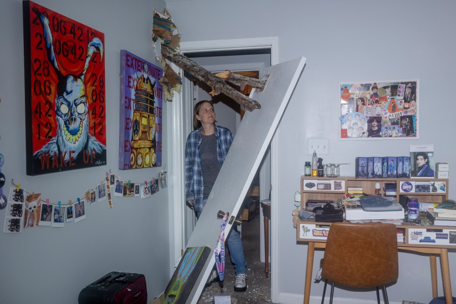 MORROW, GEORGIA – SEPTEMBER 27: Victoria Coffee, stands in her bedroom door where a tree protruded through the wall in the home she shares with her sister Molly Coffee in Morrow, Georgia on Friday, September 27, 2024. “It doesn’t feel like tragedy, it feels like we are very lucky,” said Molly Coffee about the late-night incident.