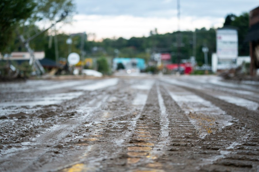 ASHEVILLE, NORTH CAROLINA – SEPTEMBER 29: Tire tracks on a mud caked street in the Biltmore Village in the aftermath of Hurricane Helene on September 29, 2024 in Asheville, North Carolina. According to reports, more than 60 people have been killed across the South due to the storm, and millions have been left without power. North Carolina has been approved for a Federal Major Disaster Declaration. (Photo by Sean Rayford/Getty Images)
