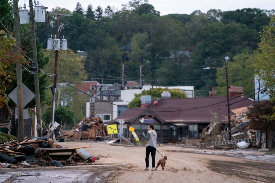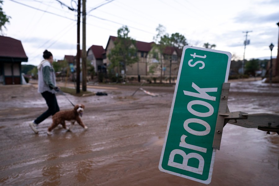 ASHEVILLE, NORTH CAROLINA – SEPTEMBER 29: Mary Grace and her dog, Marley, walk around the Biltmore Village in the aftermath of Hurricane Helene on September 29, 2024 in Asheville, North Carolina. According to reports, more than 60 people have been killed across the South due to the storm, and millions have been left without power. North Carolina has been approved for a Federal Major Disaster Declaration. (Photo by Sean Rayford/Getty Images)