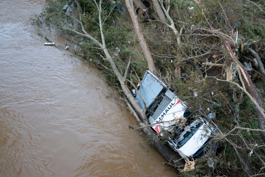 ASHEVILLE, NORTH CAROLINA – SEPTEMBER 29: A storm-damaged U-Haul pickup truck sits along a flooded waterway in the aftermath of Hurricane Helene on September 29, 2024 in Asheville, North Carolina. According to reports, more than 60 people have been killed across the South due to the storm, and millions have been left without power. North Carolina has been approved for a Federal Major Disaster Declaration. (Photo by Sean Rayford/Getty Images)