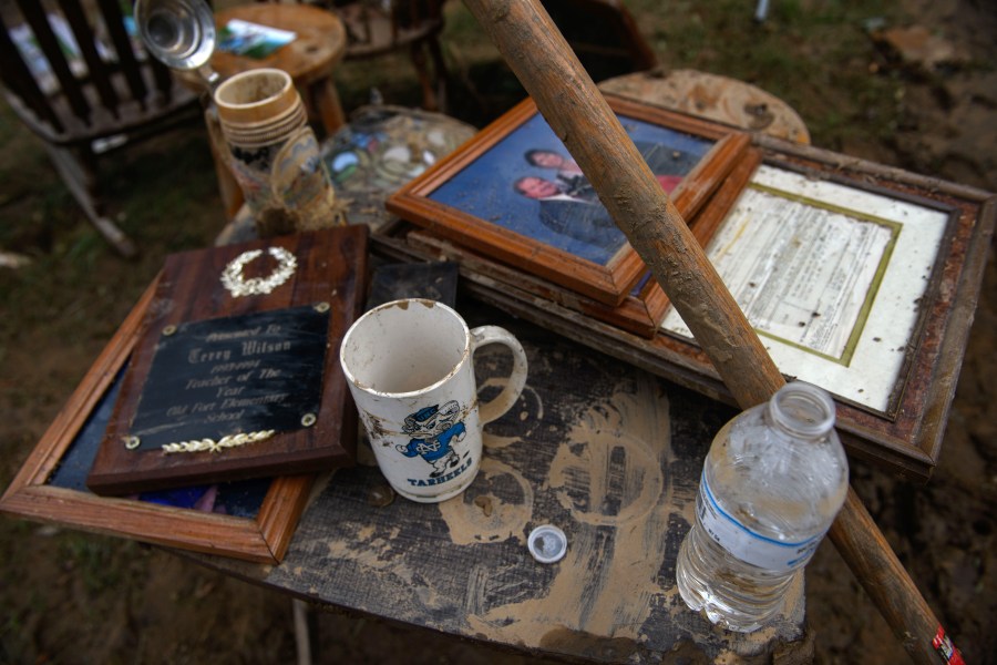 OLD FORT, NORTH CAROLINA – SEPTEMBER 29: Keep sakes belonging to Terry Wilson lay outside his mother’s home in the aftermath of Hurricane Helene on September 29, 2024 in Old Fort, North Carolina. Wilson said their beloved dog’s ashes were found after the flooding. According to reports, more than 60 people have been killed across the South due to the storm, and millions have been left without power. North Carolina has been approved for a Federal Major Disaster Declaration. (Photo by Melissa Sue Gerrits/Getty Images)
