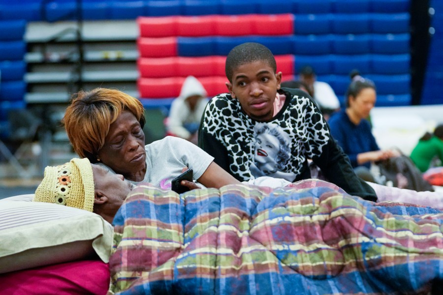 Bobby Joe Edwards, Sr., and his wife Lillie Edwards, of Walkalla, Fla., and their grandson Tavarrious Dixon, right, rest inside a hurricane evacuation shelter at Fairview Middle School, ahead of Hurricane Helene, expected to make landfall here today, in Leon County, Fla., Thursday, Sept. 26, 2024. (AP Photo/Gerald Herbert)