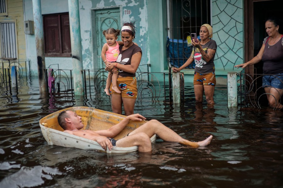 A man floats in a container on a street flooded by the passing of Hurricane Helene, in Batabano, Mayabeque province, Cuba, Thursday, Sept. 26, 2024. (AP Photo/Ramon Espinosa)