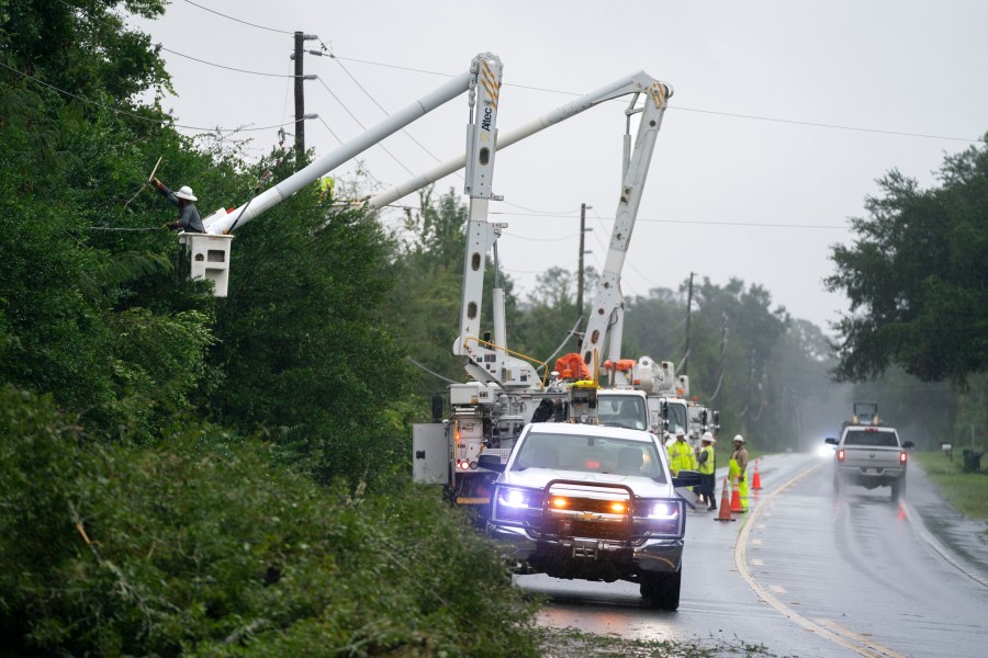 CRAWFORDVILLE, FLORIDA – SEPTEMBER 26: Utility crews repair a line damaged by an outer band of Hurricane Helene on the morning of September 26, 2024 near Crawfordville, Florida. Hurricane Helene is forecasted to make landfall nearby along the gulf coast this evening. (Photo by Sean Rayford/Getty Images)