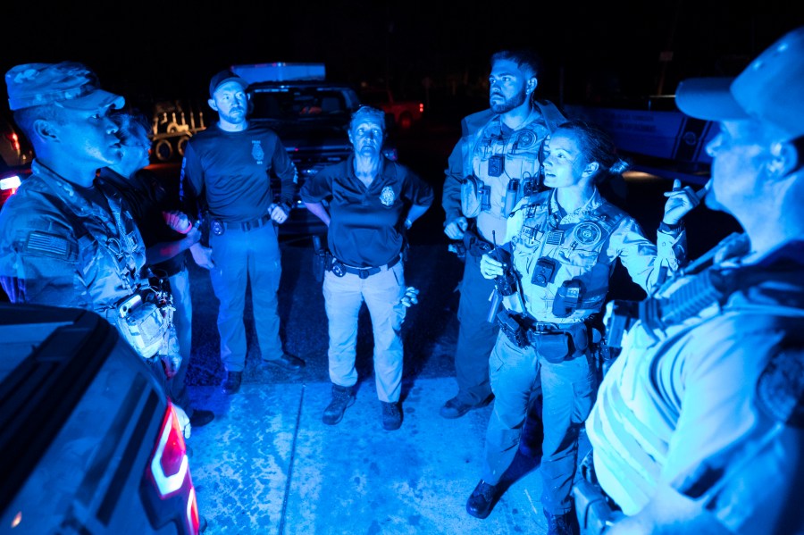 STEINHATCHEE, FLORIDA – SEPTEMBER 27: Emergency responders share information in the aftermath of Hurricane Helene on September 27, 2024 near Steinhatchee, Florida. Hurricane Helene made landfall nearby last night as a category four storm but has weakened as it moves inland. (Photo by Sean Rayford/Getty Images)