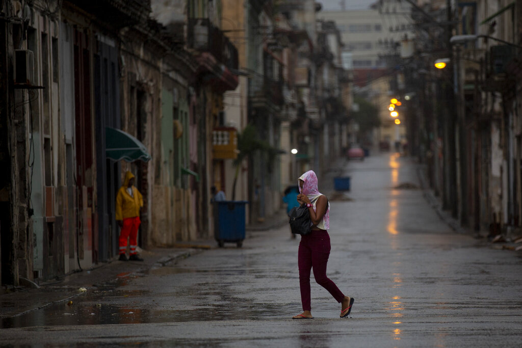 A pedestrian crosses an empty street during the passing of Hurricane Ian in Havana, Cuba, early Thursday, Sept. 27, 2022. (AP Photo/Ismael Francisco)