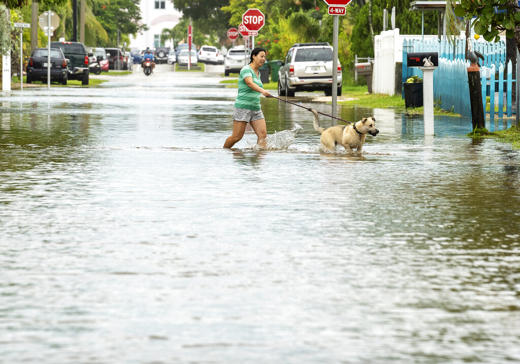 A dog is walked through floodwater as the tide rise, Tuesday, Sept. 27, 2022, in Key West, Fla., as the first bands of rain associated with Hurricane Ian pass to the west of the island chain. Ian was forecast to strengthen even more over warm Gulf of Mexico waters, reaching top winds of 140 mph (225 kmh) as it approaches the Florida’s southwest coast. (Rob O’Neal/The Key West Citizen via AP)