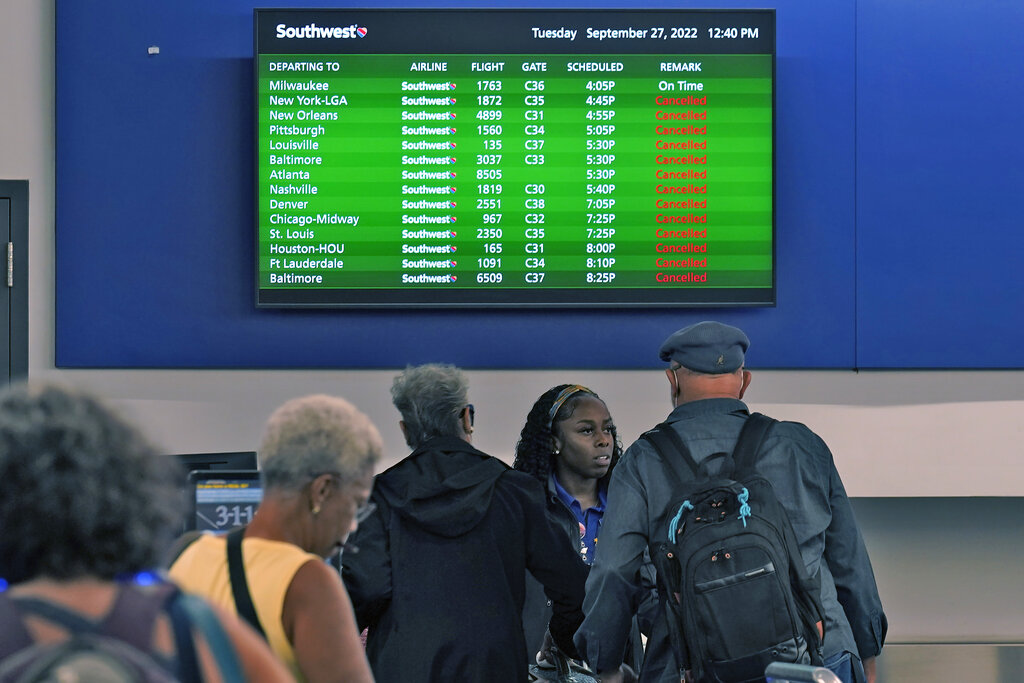 Southwest Airline passengers check into a ticket counter near a sign that shows canceled flights at the Tampa International Airport Tuesday, Sept. 27, 2022, in Tampa, Fla. The airport is closing at 5pm EST today ahead of Hurricane Ian. Ian is predicted to make landfall somewhere along Florida’s west coast. (AP Photo/Chris O’Meara)