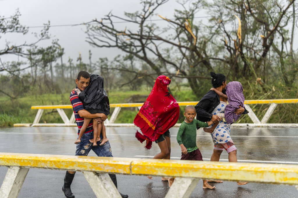 A family walks through the rain in search of shelter after their home flooded when Hurricane Ian hit in Pinar del Rio, Cuba, Tuesday, Sept. 27, 2022. Ian made landfall at 4:30 a.m. EDT Tuesday in Cuba’s Pinar del Rio province, where officials set up shelters, evacuated people, rushed in emergency personnel and took steps to protect crops in the nation’s main tobacco-growing region. (AP Photo/Ramon Espinosa)