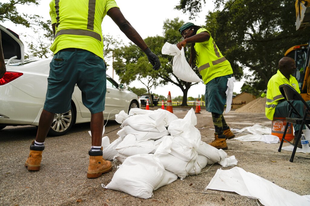 City employees load sandbags into people’s cars as they pull up to a station at Northwest Park, in preparation for Hurricane Ian, Tuesday, Sept. 27, 2022, in St. Petersburg, Fla. (Martha Asencio-Rhine/Tampa Bay Times via AP)