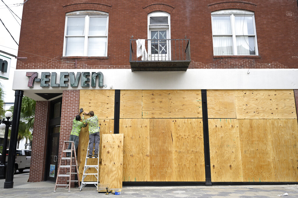 Workers board up the windows of a 7-Eleven convenience store in the Ybor City district in preparation for Hurricane Ian approaches the western side of the state, Tuesday, Sept. 27, 2022, in Tampa, Fla. (AP Photo/Phelan M. Ebenhack)