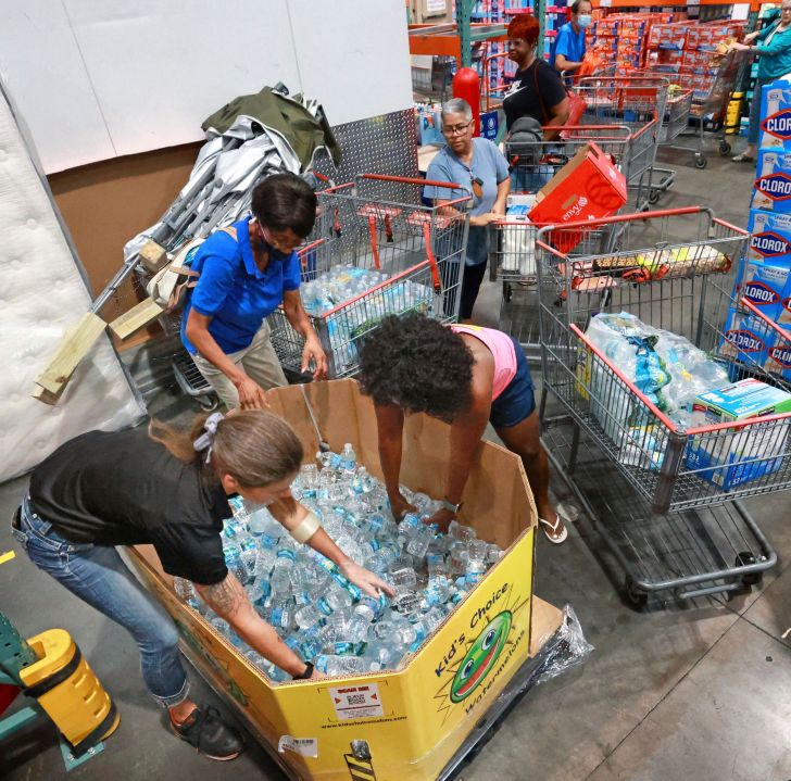 Shoppers at the Costco store in Altamonte Springs, Fla. grab bottles of water from the last pallet in stock on Monday, Sept. 26, 2022, as Central Floridians prepare for the impact of Hurricane Ian. (Joe Burbank/Orlando Sentinel via AP)