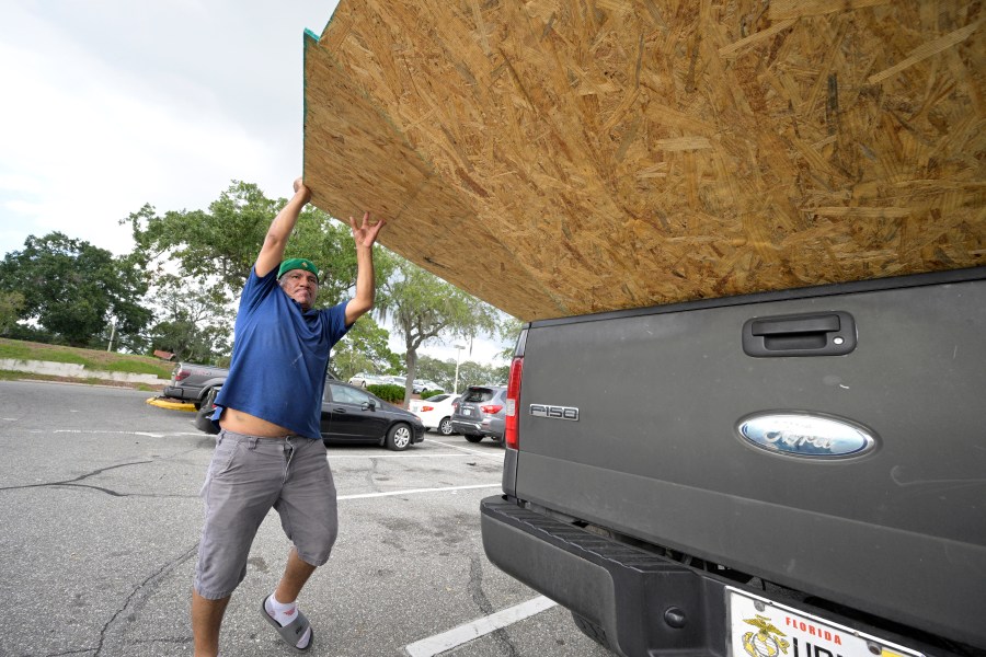 Jesus Rodrigues loads wood in his vehicle outside a Home Depot store in preparation for the arrival of Hurricane Ian, Monday, Sept. 26, 2022, in Orlando, Fla. Ian was growing stronger as it approached the western tip of Cuba on a track to hit the west coast of Florida as a major hurricane as early as Wednesday. (AP Photo/Phelan M. Ebenhack)