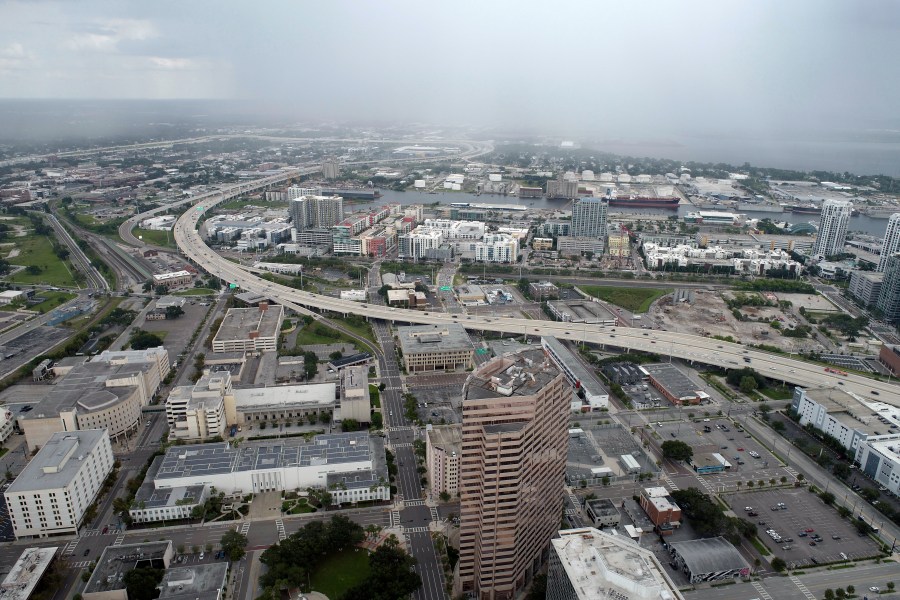 In this aerial image, the city of Tampa, Fla., is seen Monday, Sept. 26, 2022. Hurricane Ian was growing stronger as it barreled toward Cuba on a track to hit Florida’s west coast as a major hurricane as early as Wednesday. It’s been more than a century since a major storm like Ian has struck the Tampa Bay area, which blossomed from a few hundred thousand people in 1921 to more than 3 million today. (DroneBase via AP)