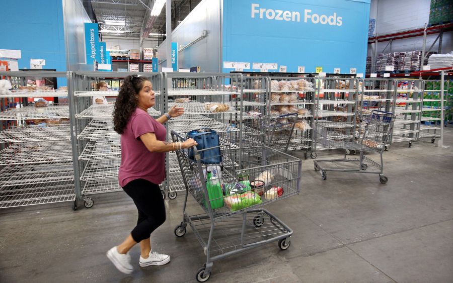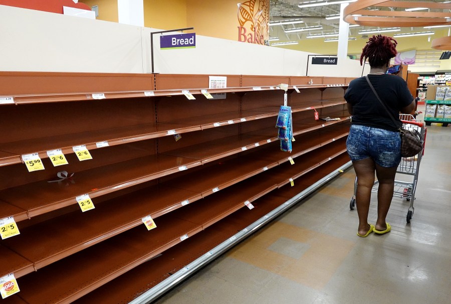 Shoppers find mostly empty bread shelves at a retail warehouse in Kissimmee, Florida, on September 26, 2022. – Tropical storm Ian has strengthened into a Category 1 hurricane the National Hurricane Center said in an advisory, warning that “additional rapid strengthening is expected today.” (Photo by Gregg Newton / Gregg Newton / AFP) (Photo by GREGG NEWTON/Gregg Newton/AFP via Getty Images)