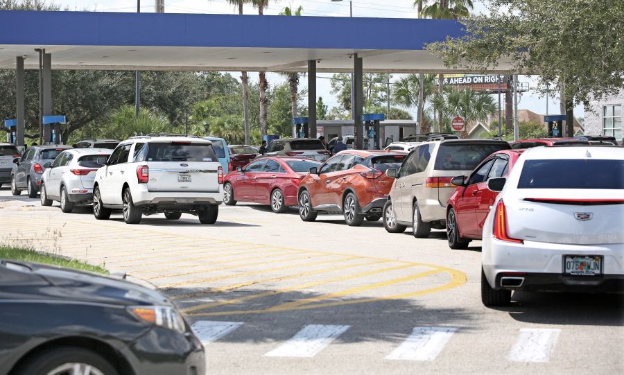 Motorists wait in long lines to fill their vehicles with gas ahead of the oncoming storm in Kissimmee, Florida, on September 26, 2022. – Tropical storm Ian has strengthened into a Category 1 hurricane the National Hurricane Center said in an advisory, warning that “additional rapid strengthening is expected today.” (Photo by Gregg Newton / Gregg Newton / AFP) (Photo by GREGG NEWTON/Gregg Newton/AFP via Getty Images)