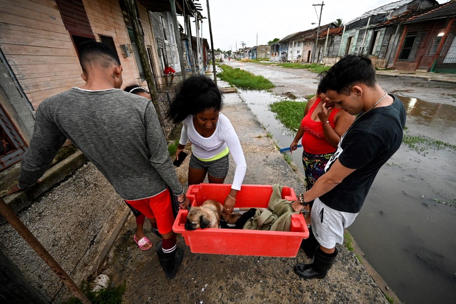 A family carries a dog to a safe place in Batabano, Mayabeque province, on September 26, 2022, ahead of the arrival of Hurricane Ian. – Cuba declared an emergency alert in its six most western provinces as fast-approaching Hurricane Ian was moving northwest towards Cuba and the Cayman Islands with maximum sustained winds of 85 miles (135 kilometres) per hour. (Photo by ADALBERTO ROQUE / AFP) (Photo by ADALBERTO ROQUE/AFP via Getty Images)