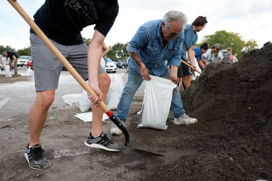 ST. PETERSBURG, FLORIDA – SEPTEMBER 26: John Gallo and other people fill sandbags at Helen Howarth Park as they prepare for the possible arrival of Hurricane Ian on September 26, 2022 in St Petersburg, Florida. Ian is projected to make it’s closest pass to the Tampa Bay area on Wednesday with the current track putting the center 25 miles west of the coastline as it parallels the coast. (Photo by Joe Raedle/Getty Images)