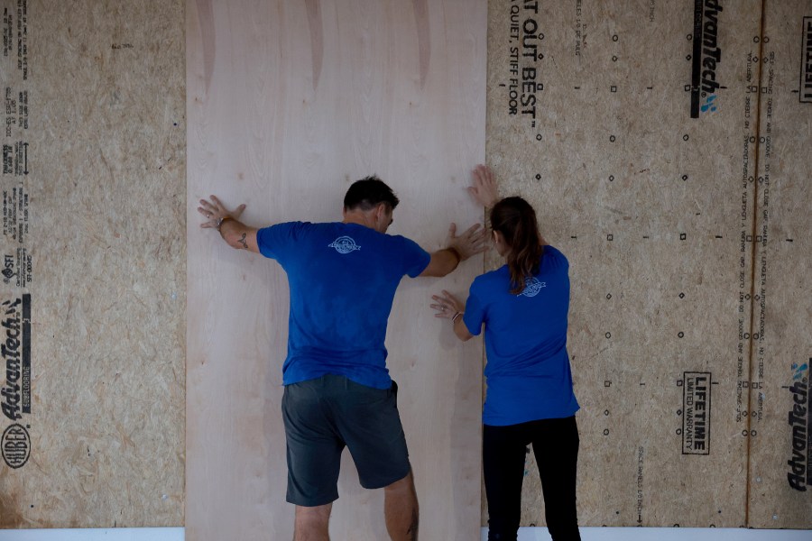 ST. PETERSBURG, FLORIDA – SEPTEMBER 26: Luca Leguerchois (L) and Eglantine Leguerchois board up their Paradise Sweets store in preparation for Hurricane Ian on September 26, 2022 in St. Petersburg, Florida. Ian is projected to make its closest pass to the Tampa Bay area tomorrow, with current tracking putting the center 25 miles west of the coastline and northern bound along the Atlantic seaboard. (Photo by Joe Raedle/Getty Images)
