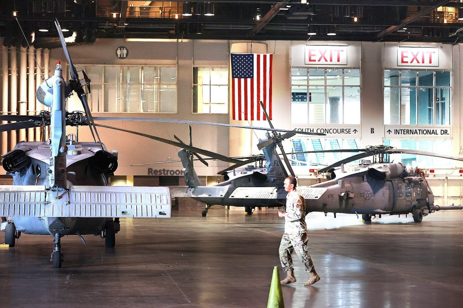 U.S. Air Force helicopters are gathered inside the Orange County Convention Center on Tuesday, Sept. 27, 2022. They were staging in preparation for Hurricane Ian, which is approaching Florida’s west coast. (Stephen M. Dowell/Orlando Sentinel via AP)