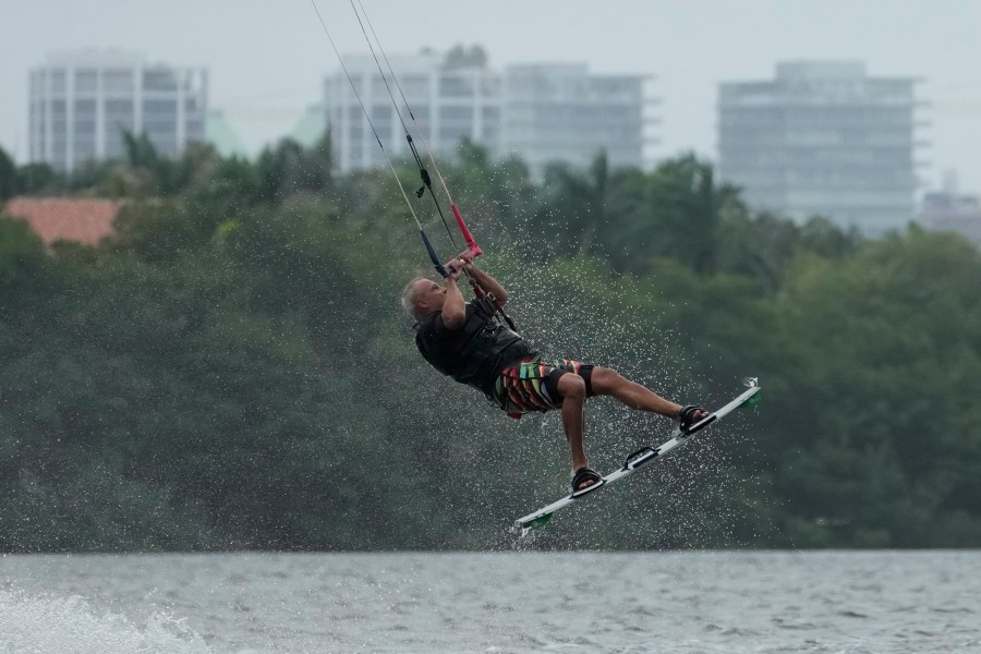 A kite surfer flies in the air as they take advantage of strong winds caused by Hurricane Ian, Tuesday, Sept. 27, 2022, at Matheson Hammock Park in Coral Gables, Fla. (AP Photo/Rebecca Blackwell)