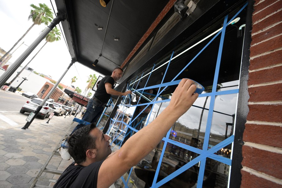Lukas Berlajolli, above, and Tony Fazliu help tape up the windows of a pizza restaurant in the Ybor City district in preparation for Hurricane Ian as the storm approaches the western side of the state, Tuesday, Sept. 27, 2022, in Tampa, Fla. (AP Photo/Phelan M. Ebenhack)