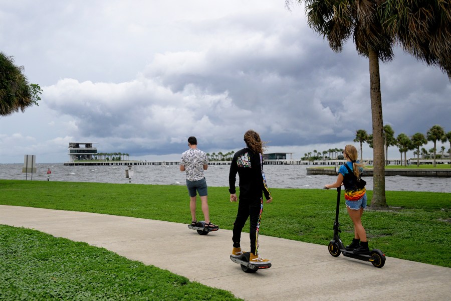 People ride along the bayfront as an outer band of Hurricane Ian approaches and kicks up the surf at Vinoy Park, Tuesday, Sept. 27, 2022, in St. Petersburg, Fla. (AP Photo/Phelan M. Ebenhack)