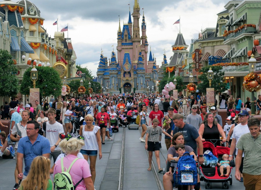 Guests depart the Magic Kingdom at Walt Disney World in the final minutes before the park closed early to accommodate an evening special event, Tuesday, Sept. 27, 2022, in Lake Buena Vista, Fla. Disney World, Universal Orlando and SeaWorld Orlando all announced Tuesday that they will be closed Wednesday and Thursday due to the weather conditions caused by Hurricane Ian. (Joe Burbank/Orlando Sentinel via AP)
