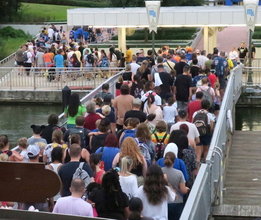 Guests depart the ferry boat transportation at the Magic Kingdom at Walt Disney World after the park closed early to accommodate an evening special event, Tuesday, Sept. 27, 2022, in Lake Buena Vista, Fla. Disney World, Universal Orlando and SeaWorld Orlando all announced Tuesday that they will be closed Wednesday and Thursday due to the weather conditions caused by Hurricane Ian. (Joe Burbank/Orlando Sentinel via AP)