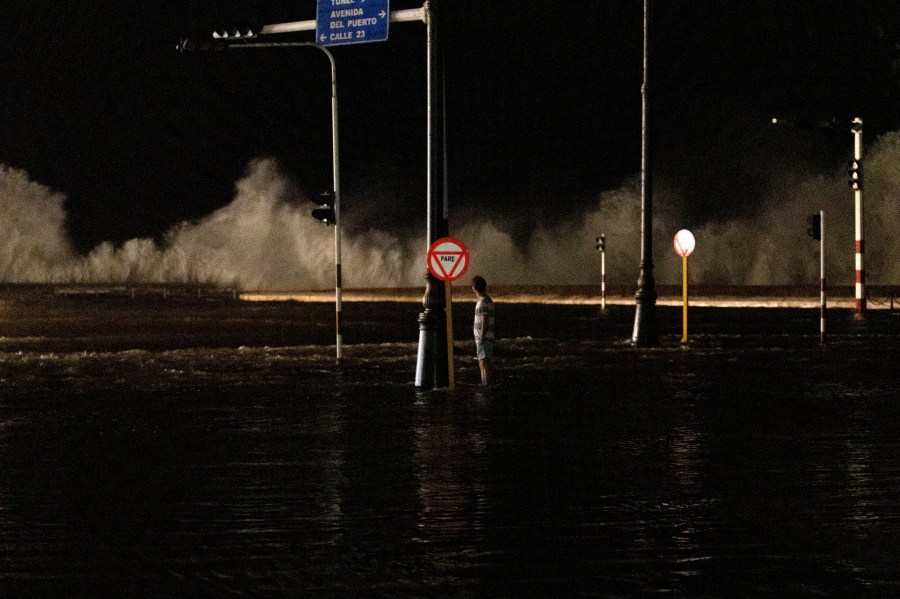 A man watches as the waves break on the boardwalk in Havana, Cuba, Wednesday, Sept. 28, 2022. Cuba remained in the dark early Wednesday after Hurricane Ian knocked out its power grid and devastated some of the country’s most important tobacco farms when it hit the island’s western tip as a major storm. (AP Photo/Ramon Espinosa)