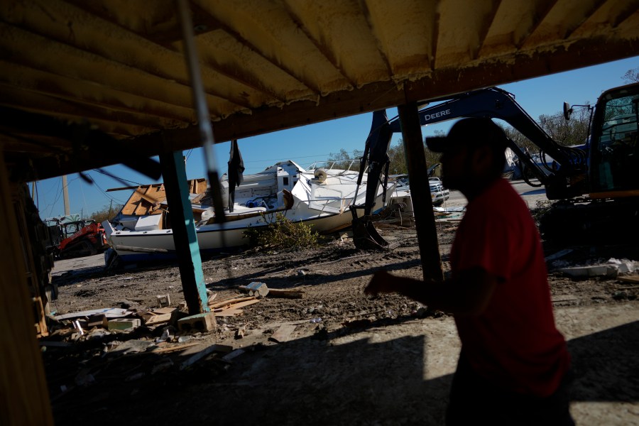 Contractors work to clear debris from the wreckage of Getaway Marina where owner Robert Leisure (not pictured) has begun the long process of rebuilding his business after the passage of Hurricane Ian, on San Carlos Boulevard in Fort Myers Beach, Fla., Sunday, Oct. 2, 2022. (AP Photo/Rebecca Blackwell)