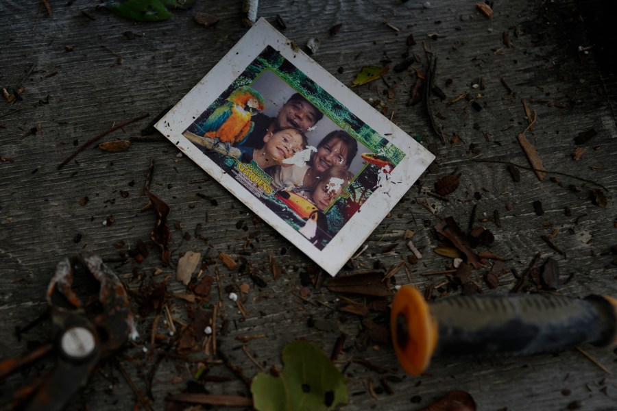 A photograph of an unknown family found by the Hudson family of Canada at their vacation home after the passage of Hurricane Ian rests alongside tools recovered from their storm-surge damaged garage level, near San Carlos Boulevard in Fort Myers Beach, Fla., Sunday, Oct. 2, 2022. (AP Photo/Rebecca Blackwell)