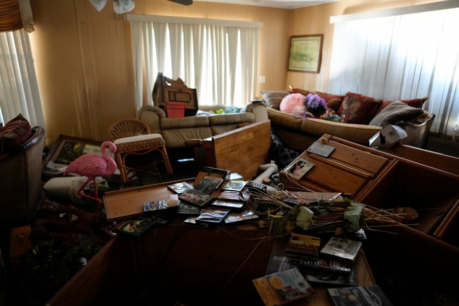 Furniture and personal items lie jumbled in the living room of Nita Ross, 79, as she returns to her mobile home for the first time since the passage of Hurricane Ian, at the Sunshine Mobile Home Park in Fort Myers, Fla., Saturday, Oct. 1, 2022. Ross’ home stayed on its foundations, unlike those of some of her neighbors, but storm flooding almost to the height of the ceiling destroyed most of her possessions and household items. (AP Photo/Rebecca Blackwell)