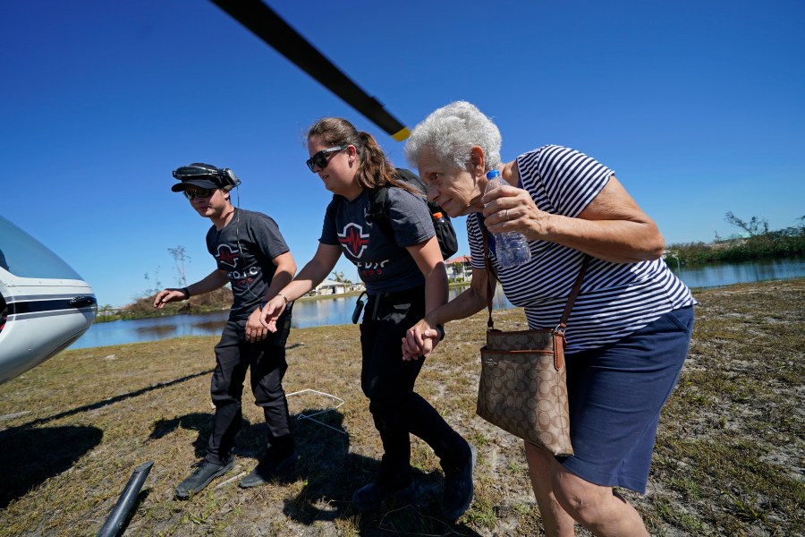 Physician Karen Calkins tends to Mona Guibord, 94, as she waits to be evacuated from Pine Island, Fla., in the aftermath of Hurricane Ian on Saturday, Oct. 1, 2022. The only bridge to the island is heavily damaged so it can only be reached by boat or air. (AP Photo/Gerald Herbert)