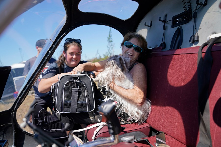 Helen Koch, a dog breeder, is evacuated with some of her 17 dogs on a helicopter for mediccorps.org, who arrived with two helicopters, paramedics and volunteers, in the aftermath of Hurricane Ian on Pine Island, Fla., Saturday, Oct. 1, 2022. The only bridge to the island is heavily damaged so it can only be reached by boat or air. (AP Photo/Gerald Herbert)