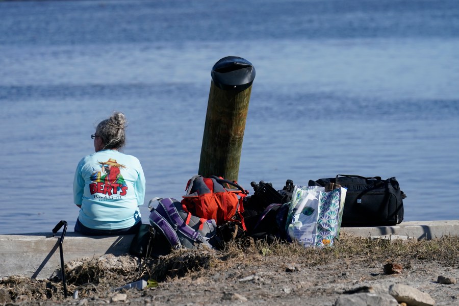 Amanda Webster, a resident of Pine Island who evacuated and since returned to retrieve belongings, sits and waits for a boat to take her off the island, in the aftermath of Hurricane Ian on Pine Island, Fla., Saturday, Oct. 1, 2022. The only bridge to the island is heavily damaged so it can only be reached by boat or air. (AP Photo/Gerald Herbert)